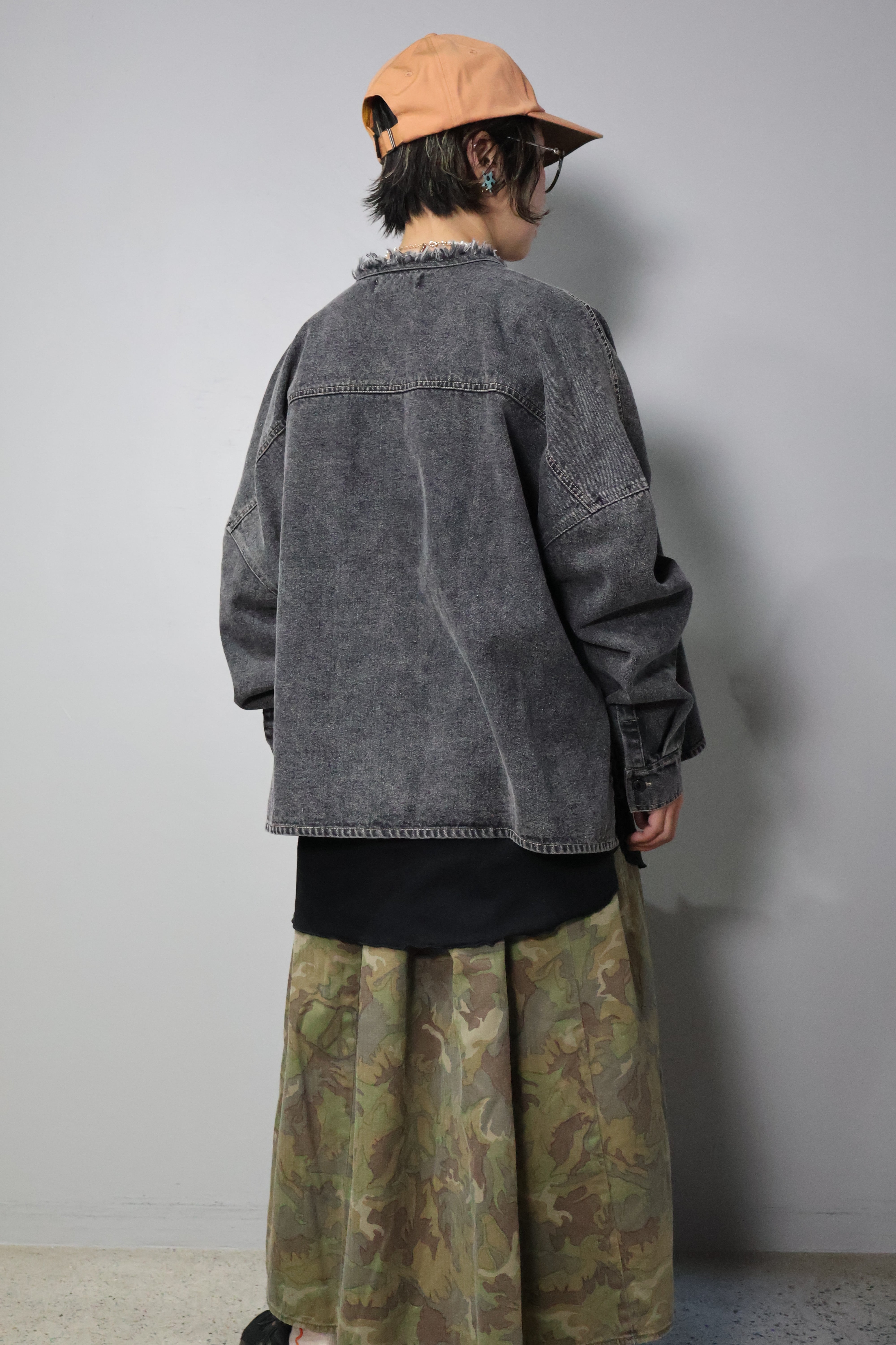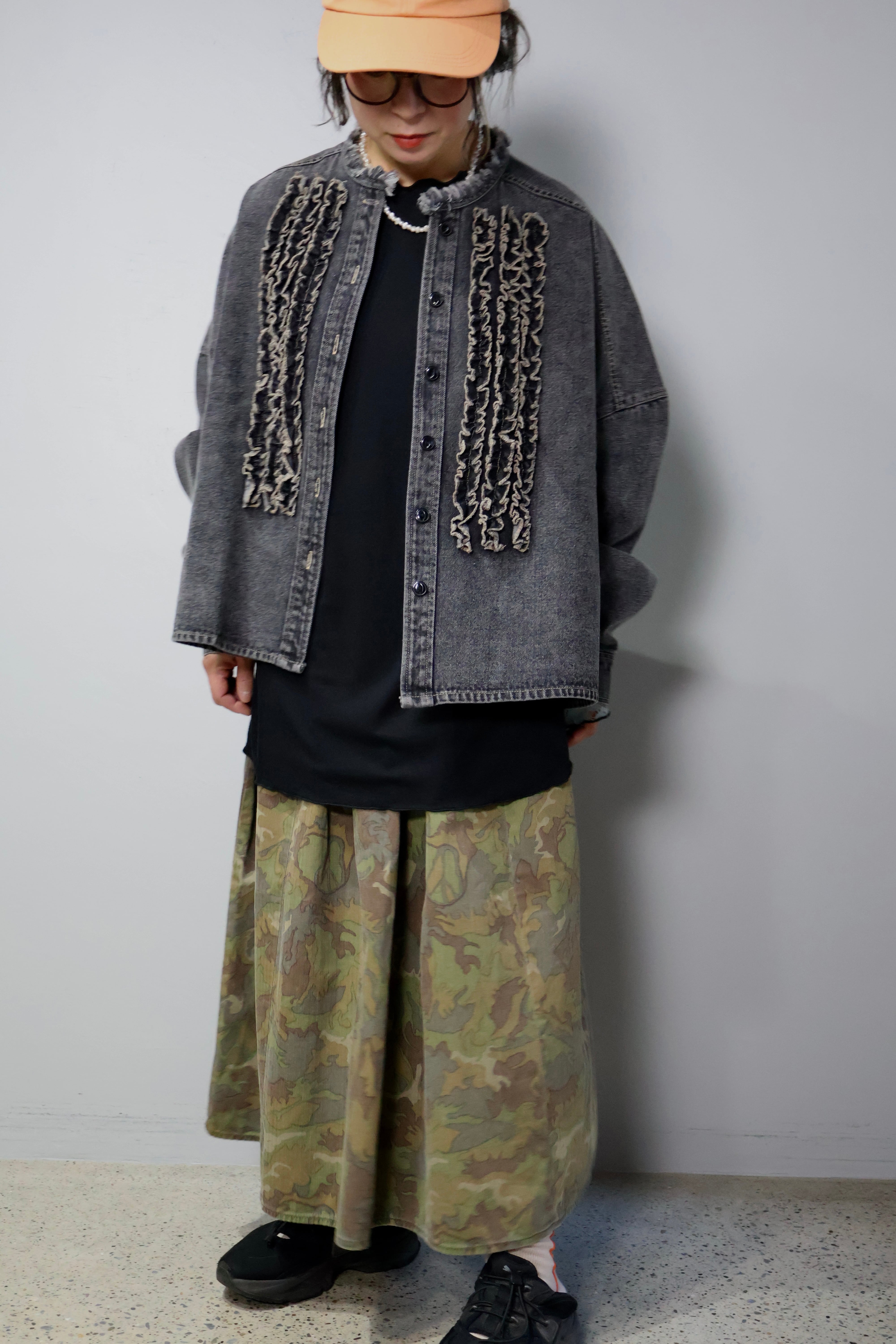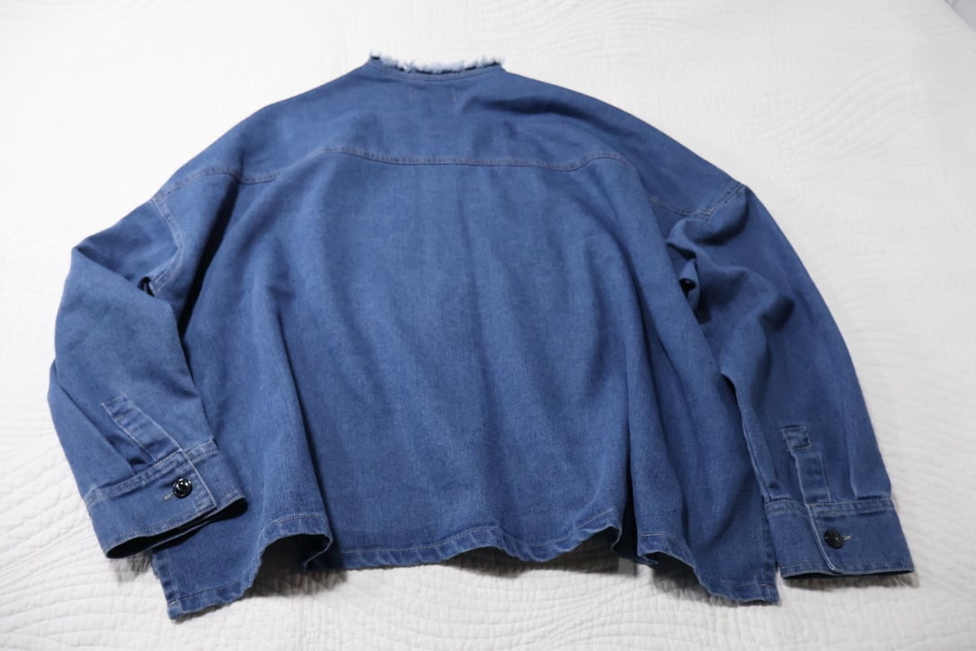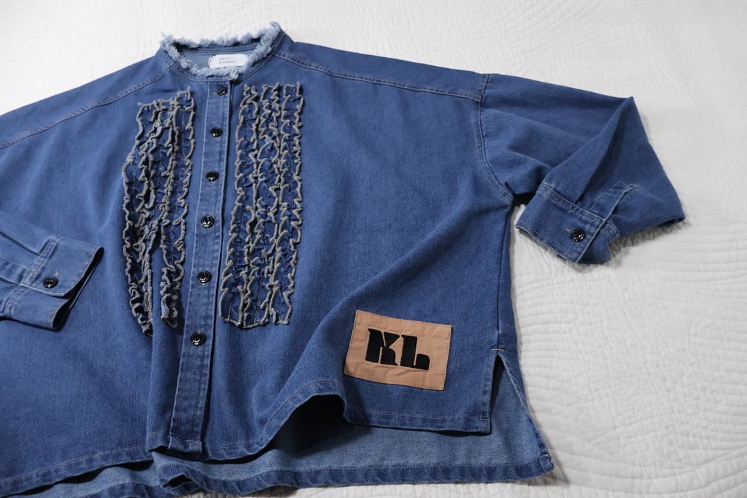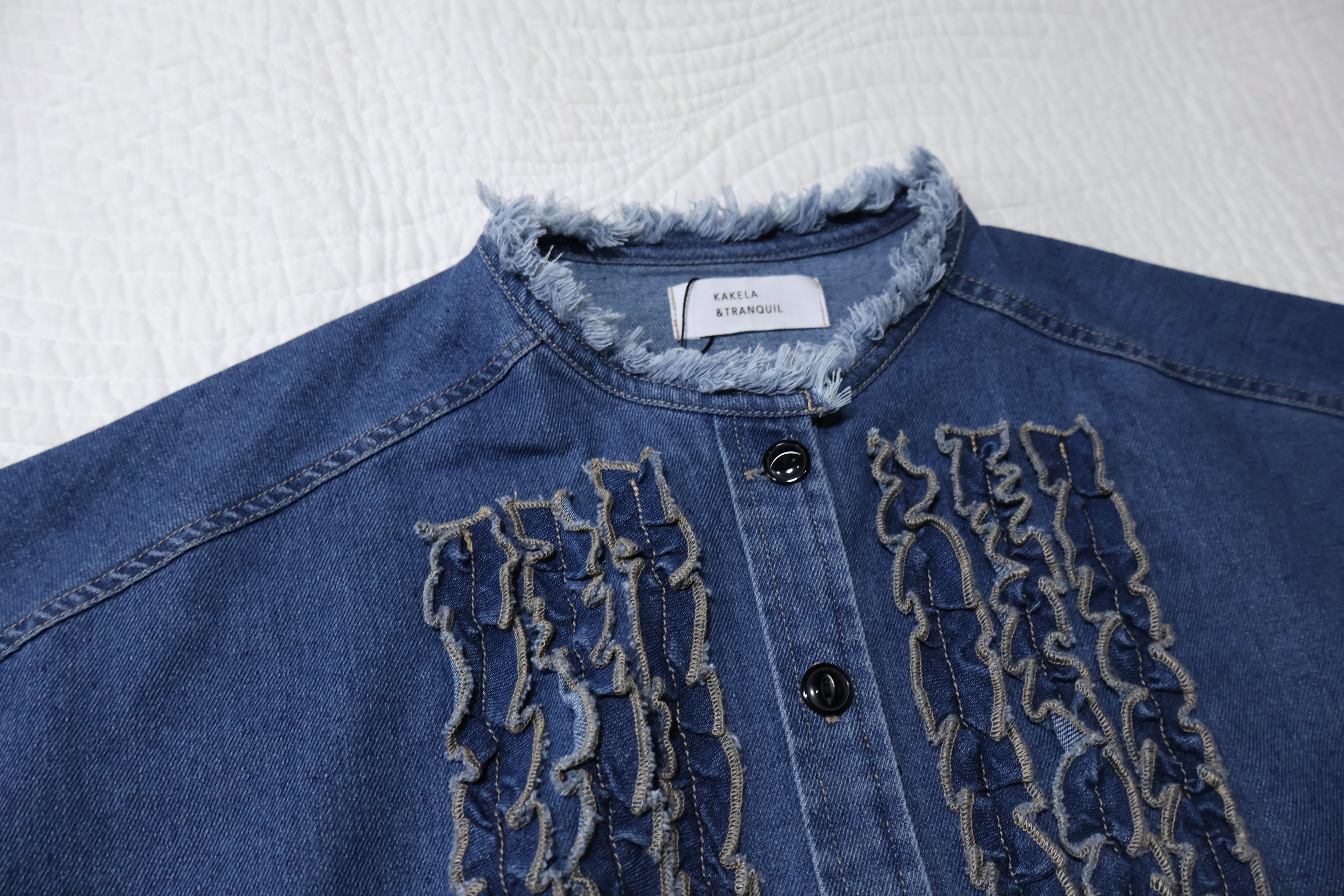 フリルの甘さとデニムの加工感がかっこいいノーカラーシャツ!