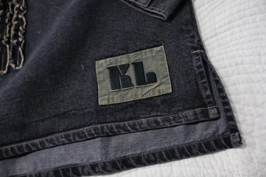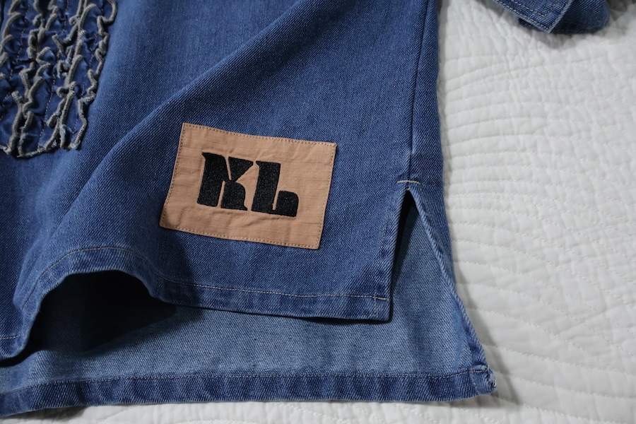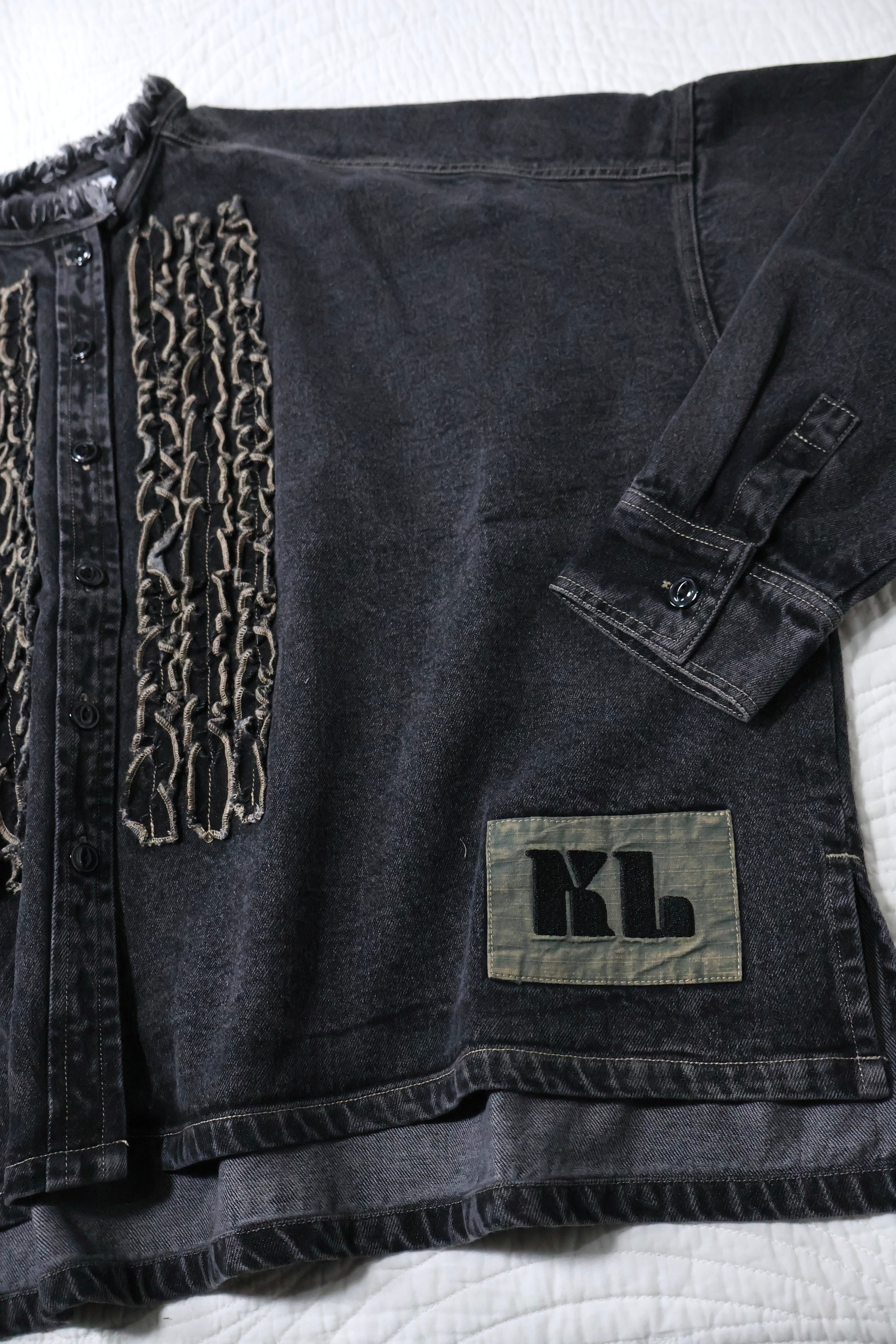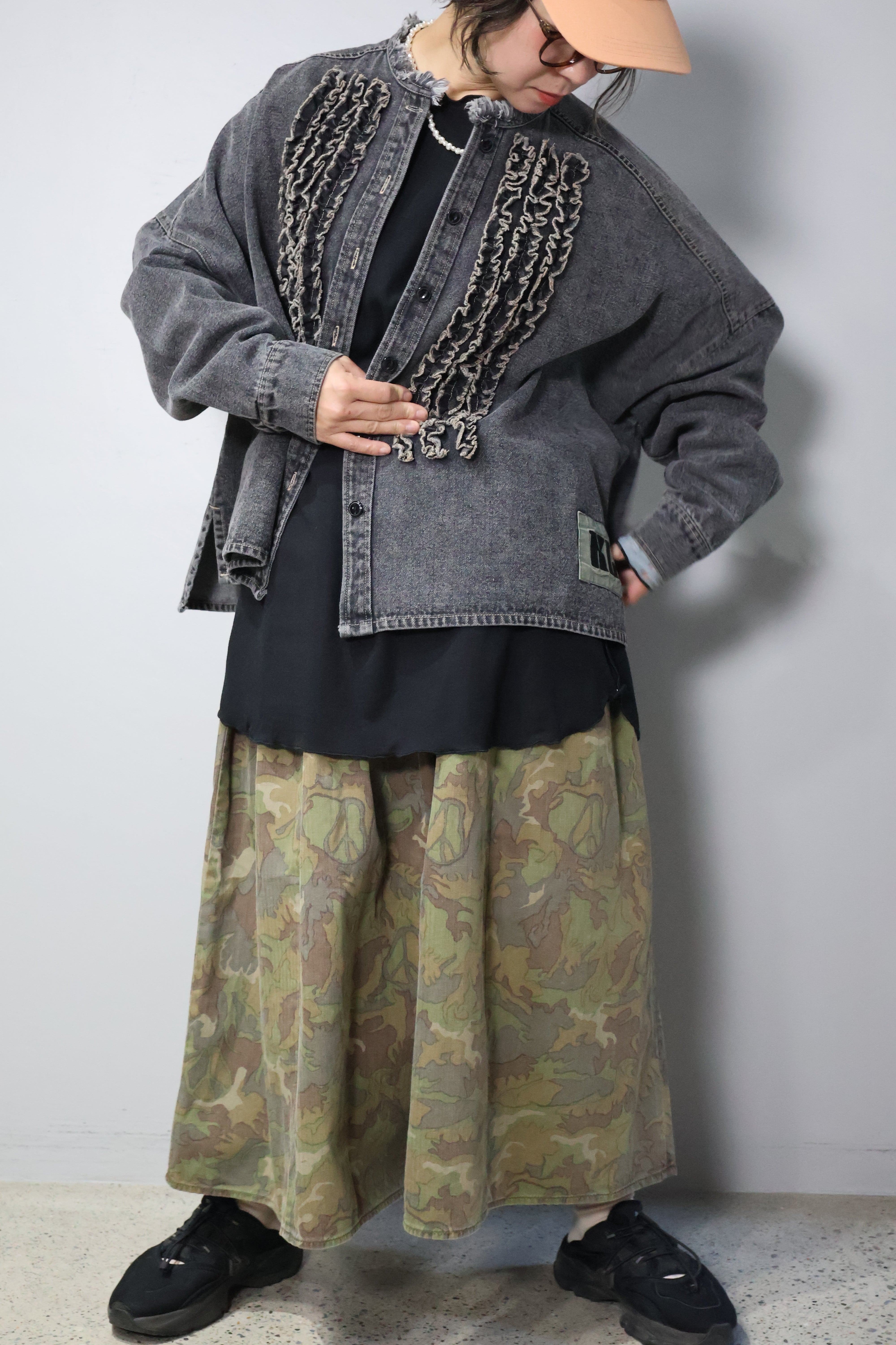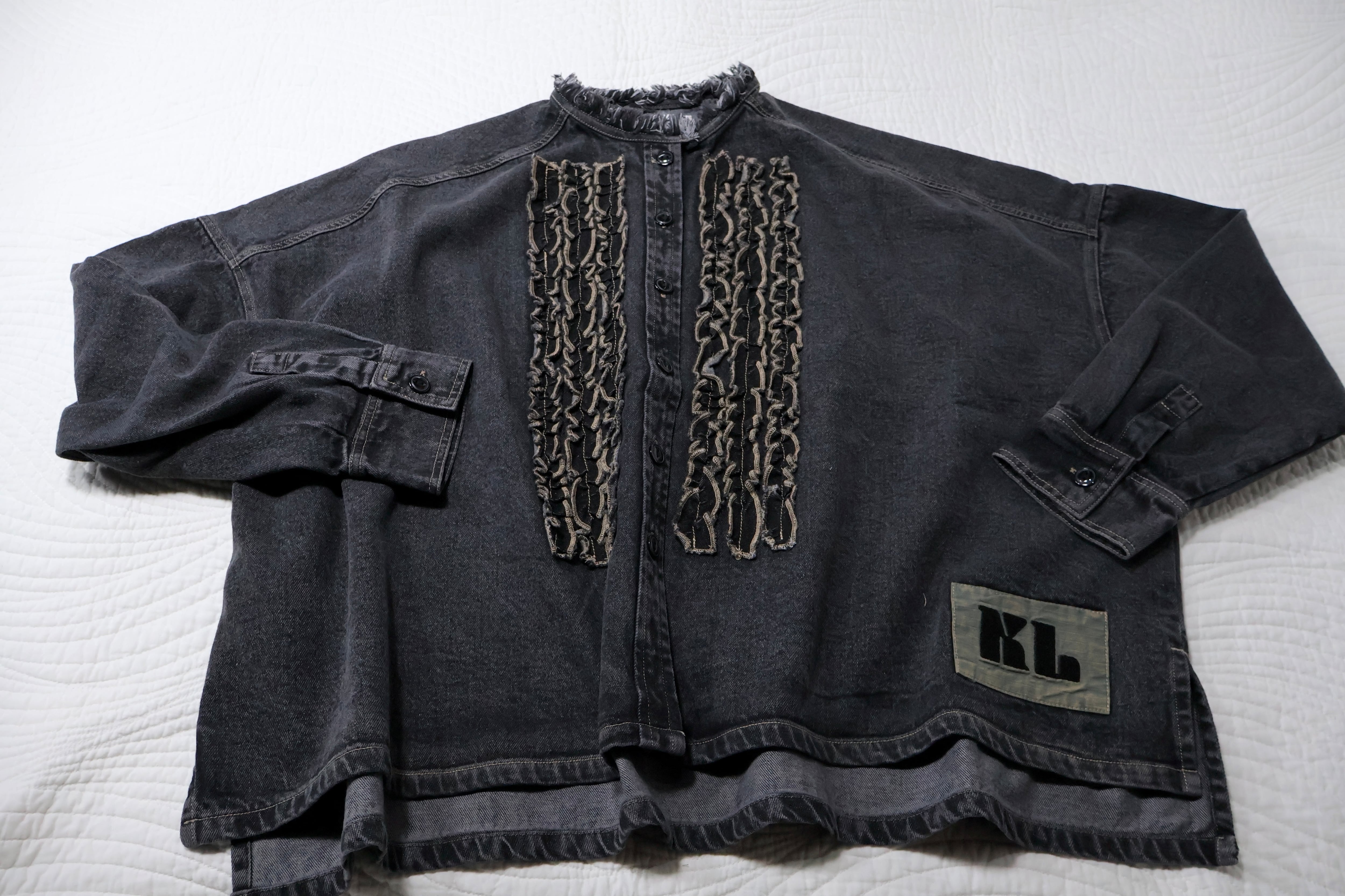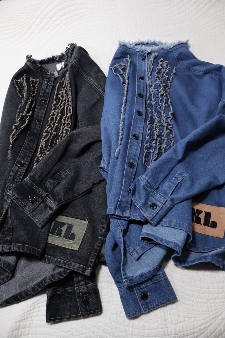 フリルの甘さとデニムの加工感がかっこいいノーカラーシャツ!