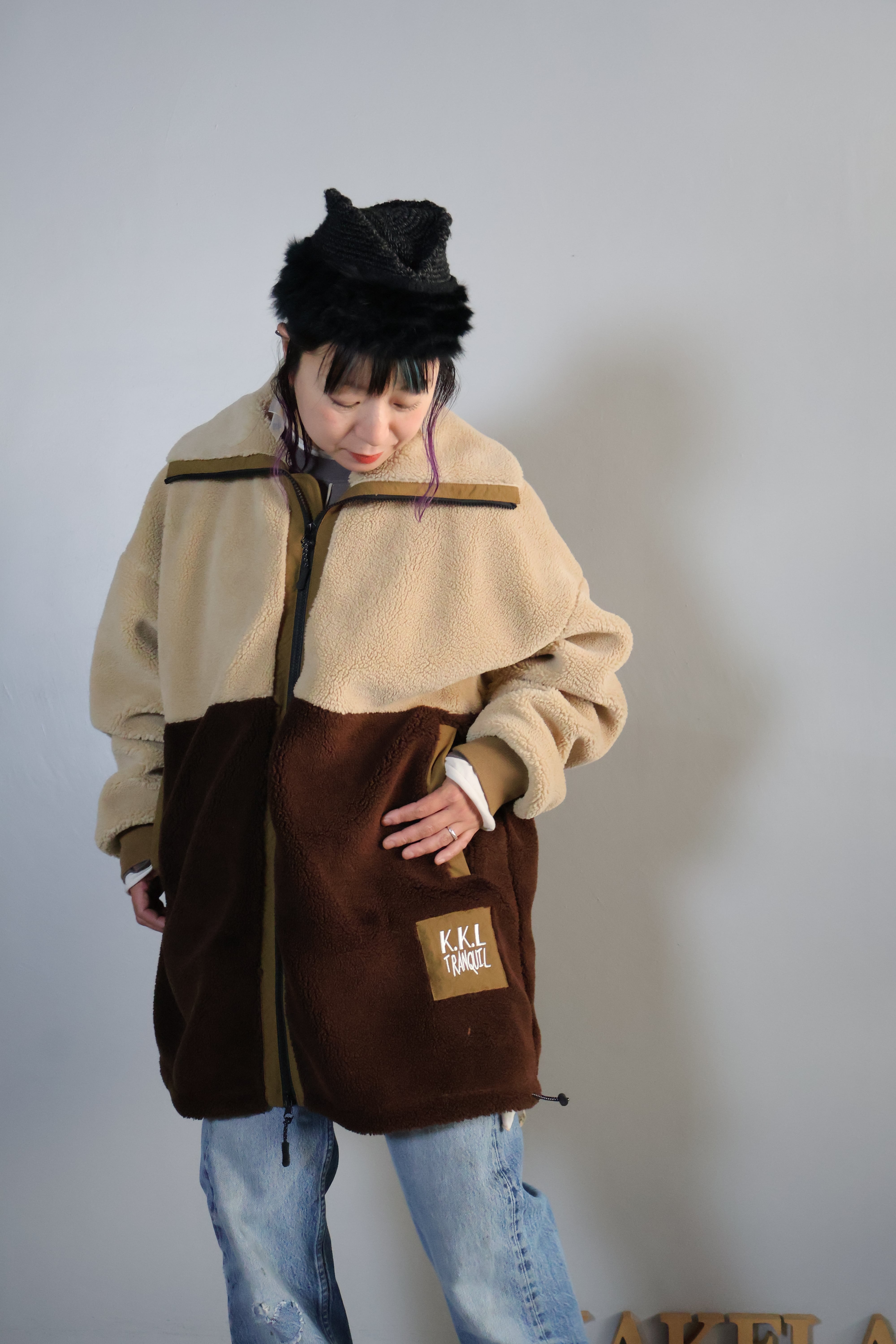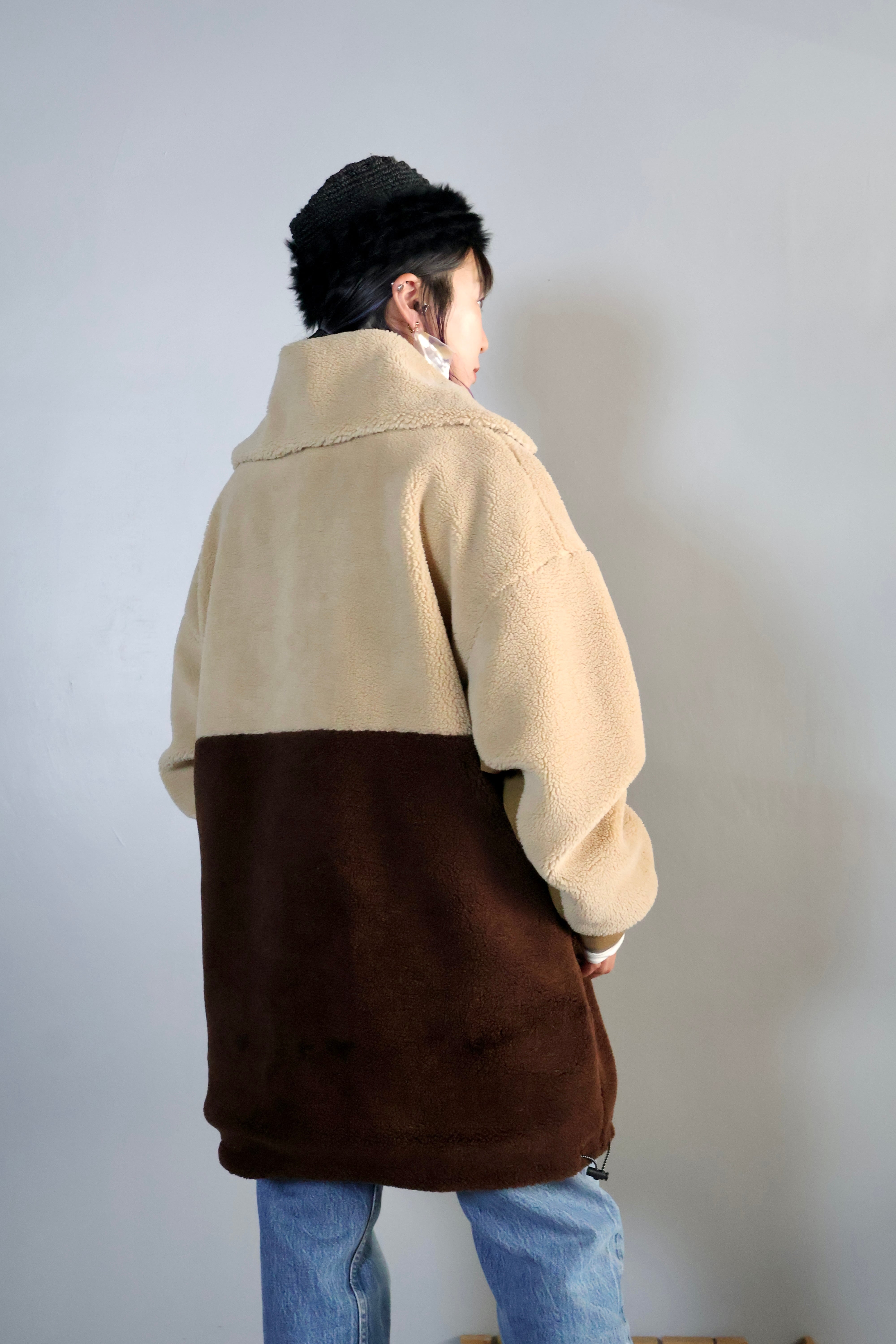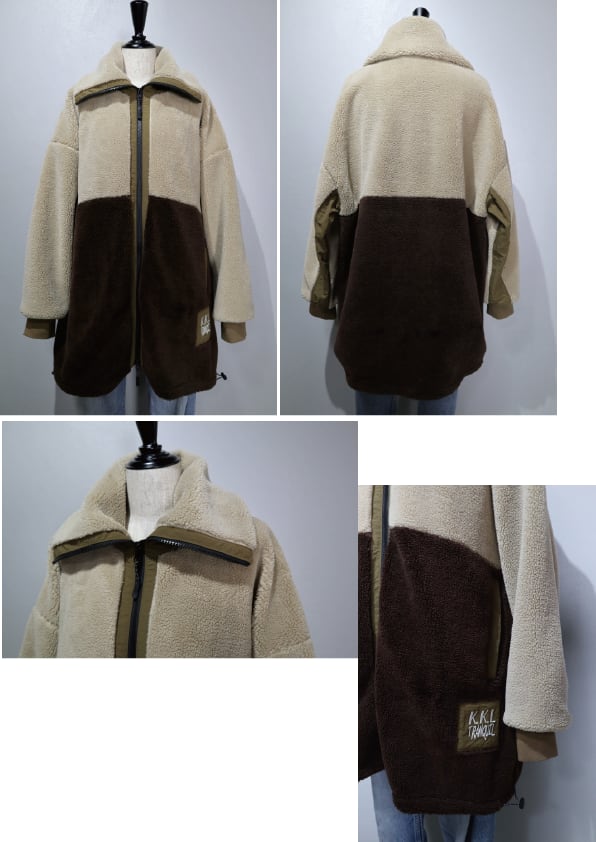 配色と高いネック部分が特徴的なアウターです。
