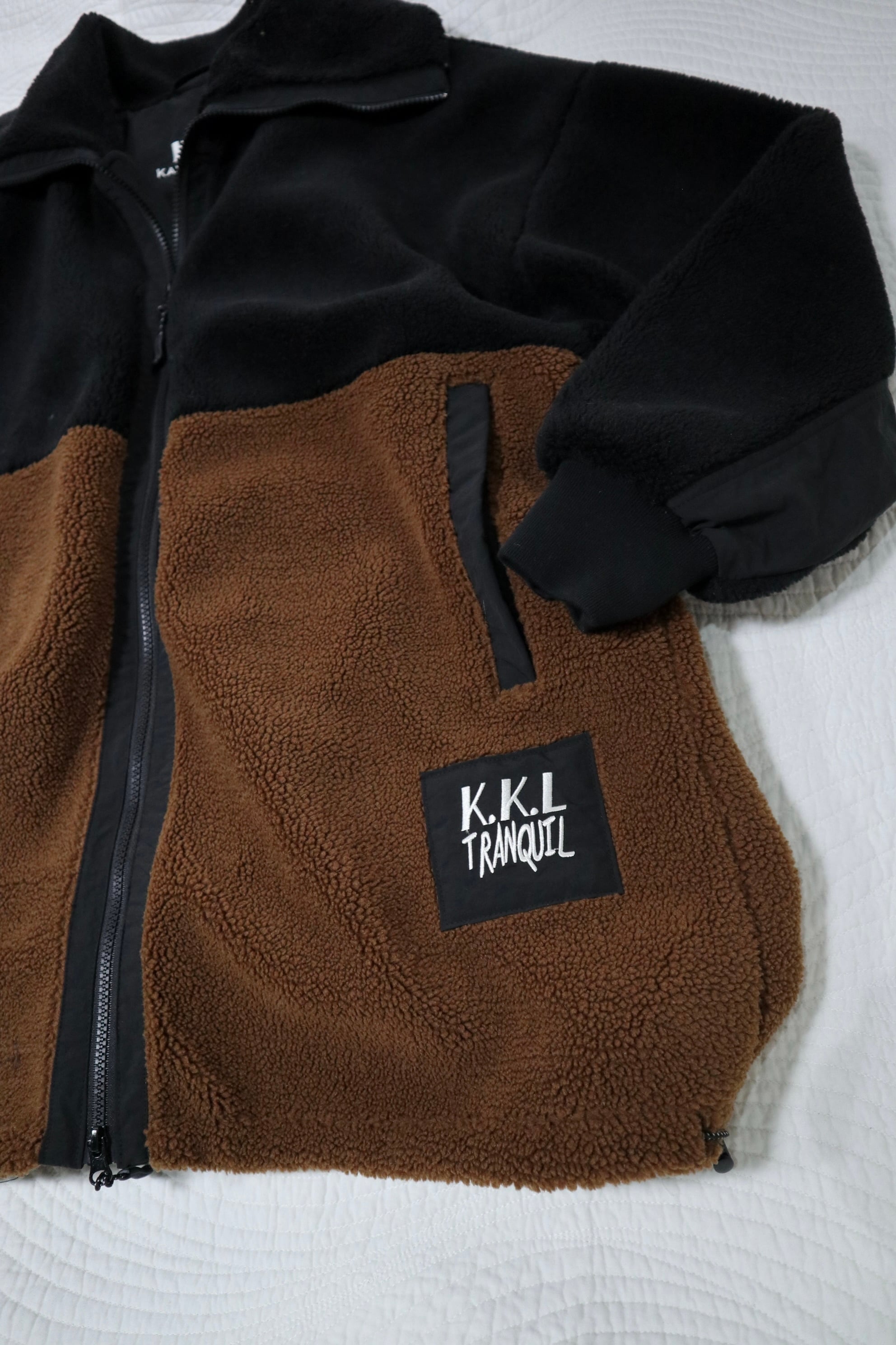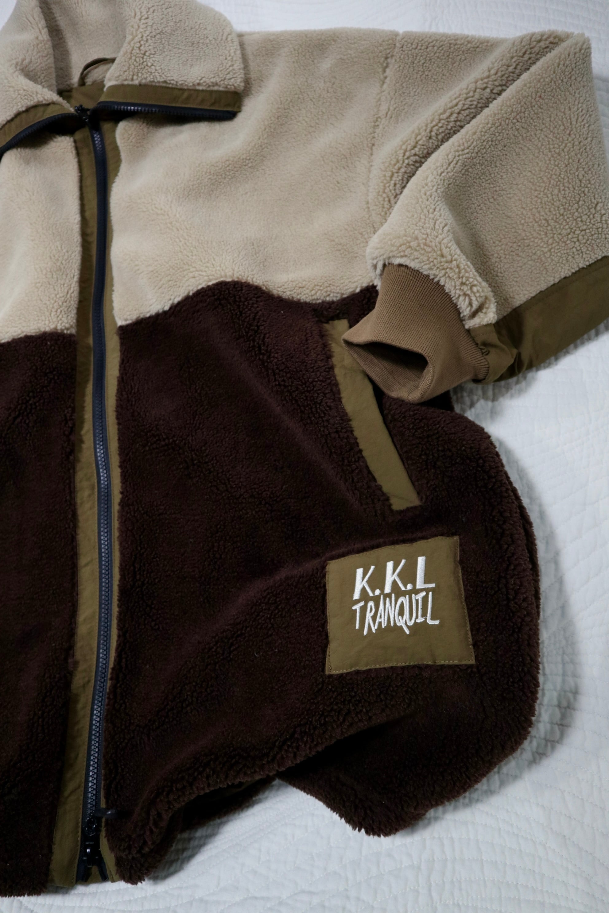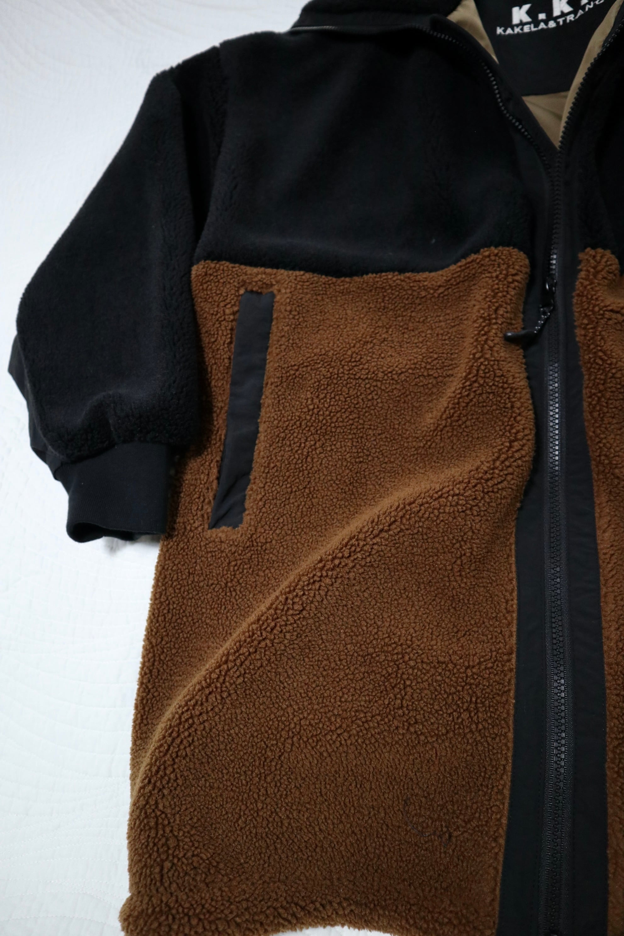 配色と高いネック部分が特徴的なアウターです。