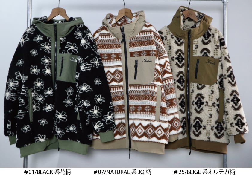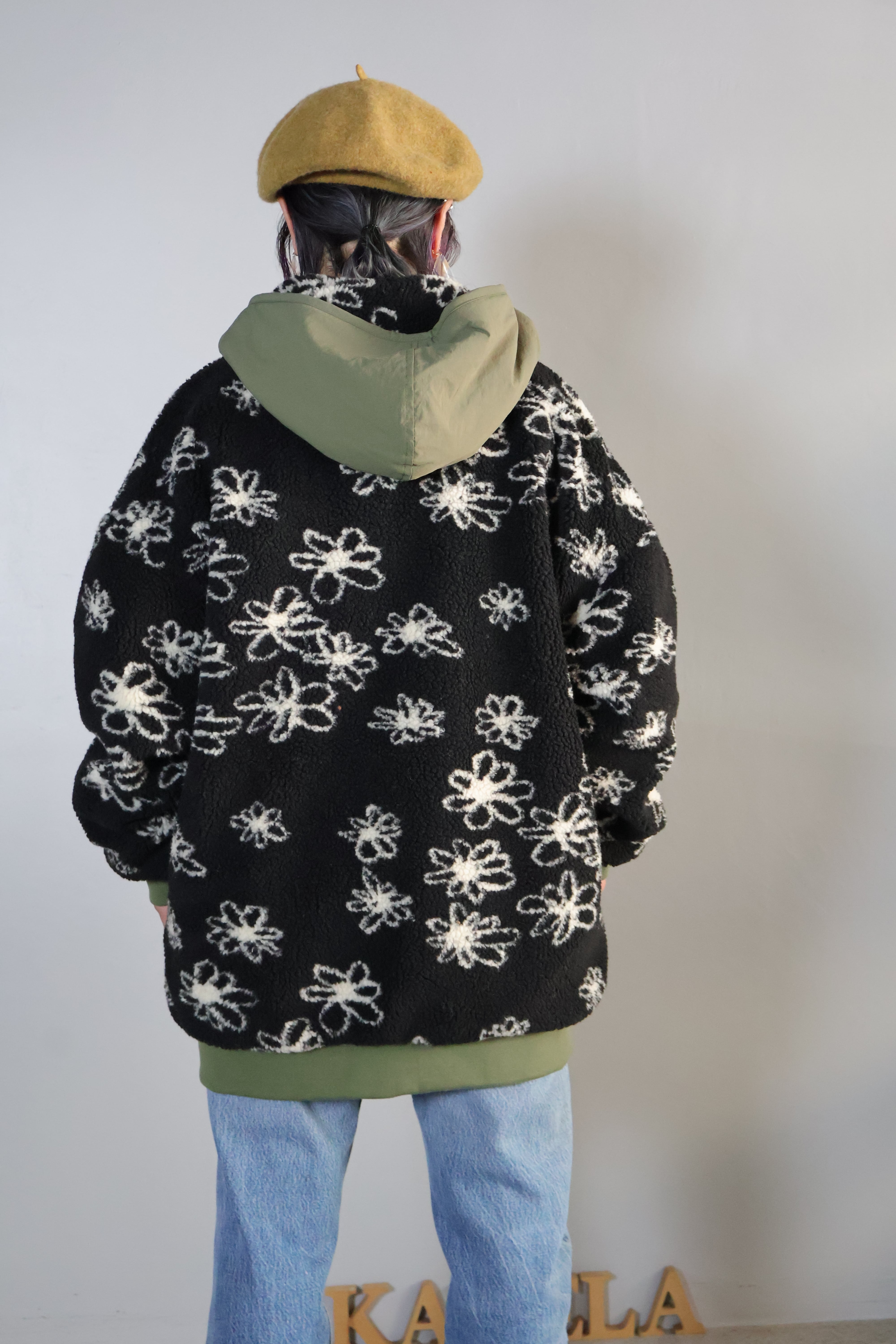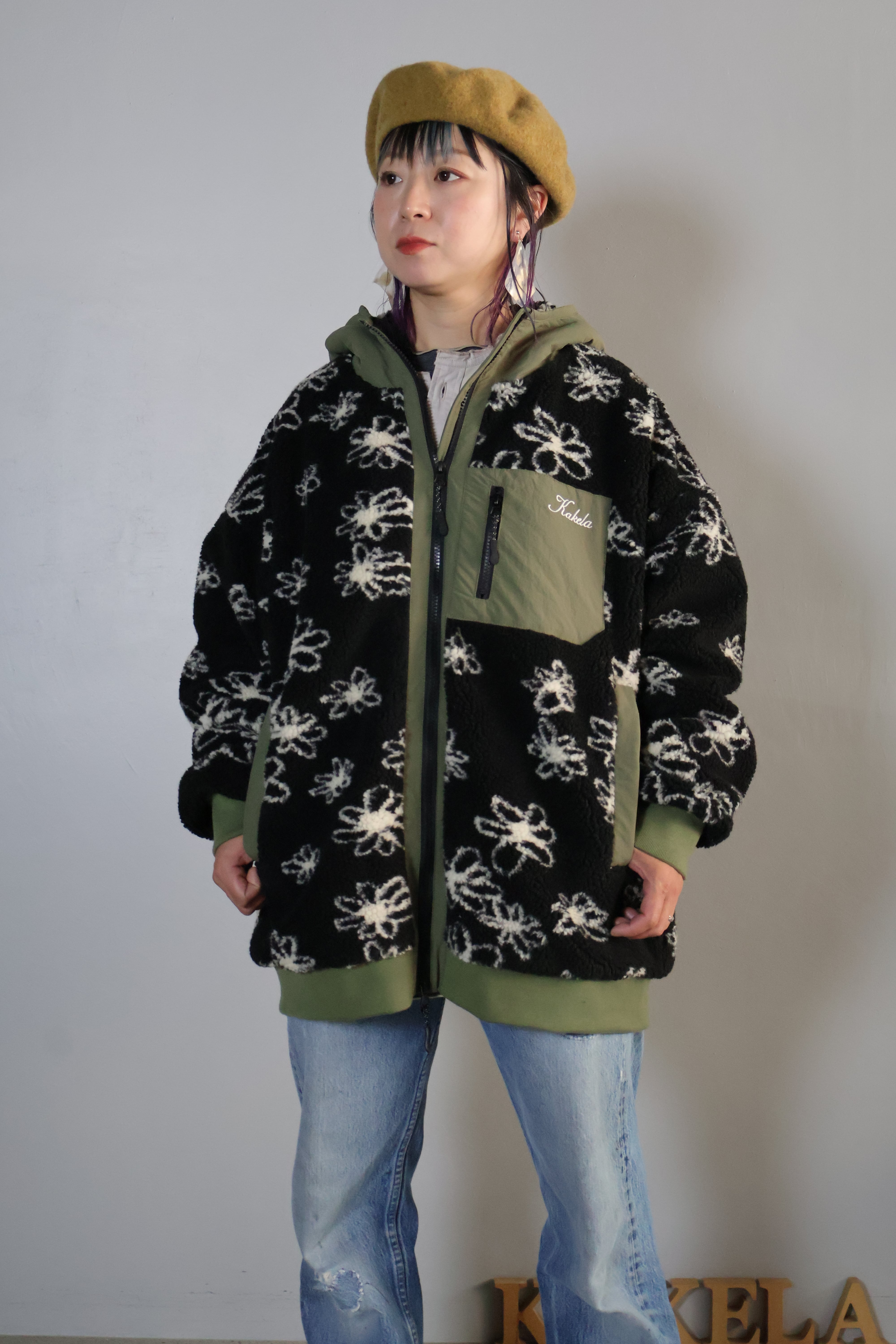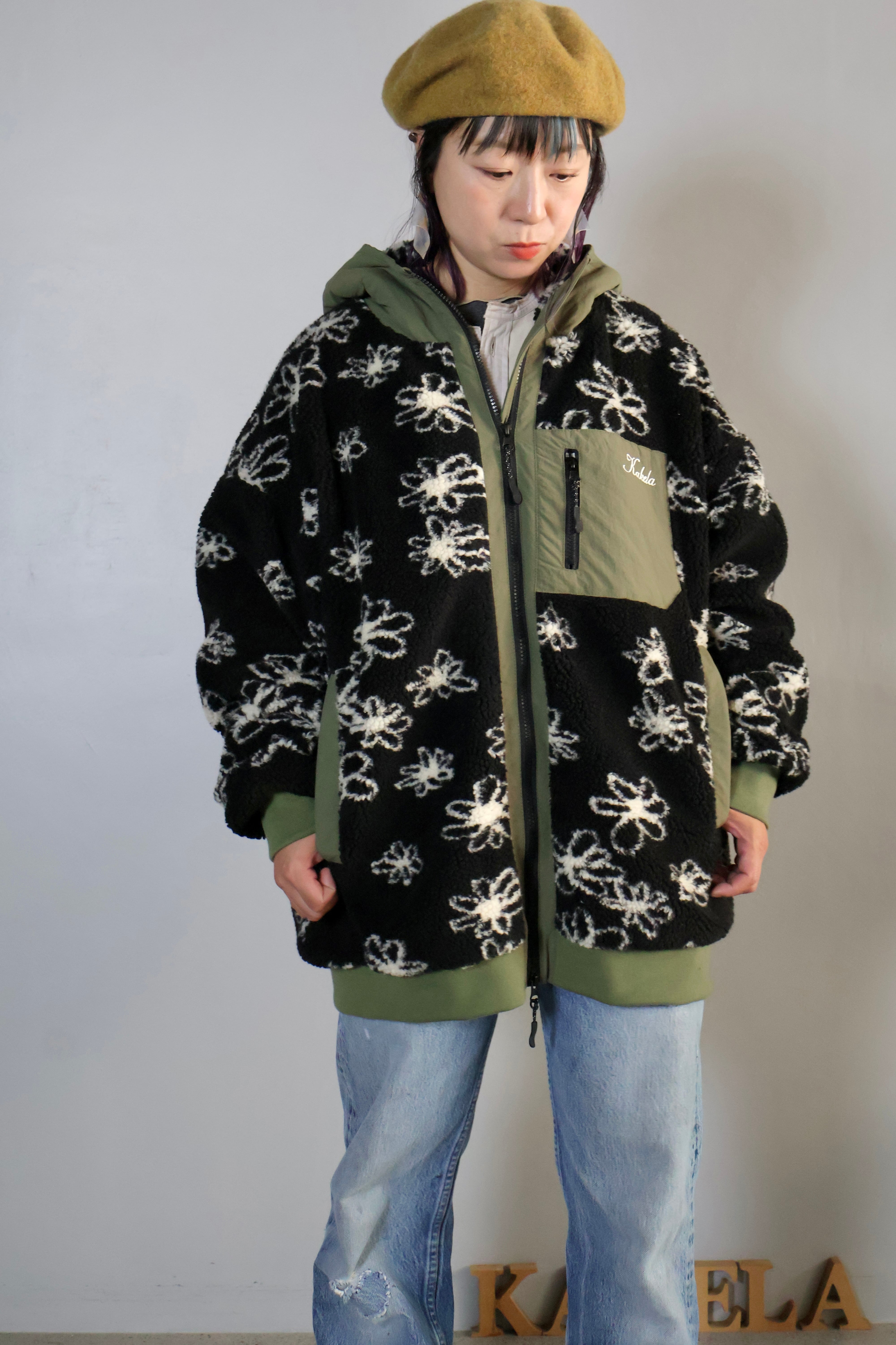柄ボア×撥水ナイロン(総裏地)フードブルゾン【BLACK系花柄 01】です。