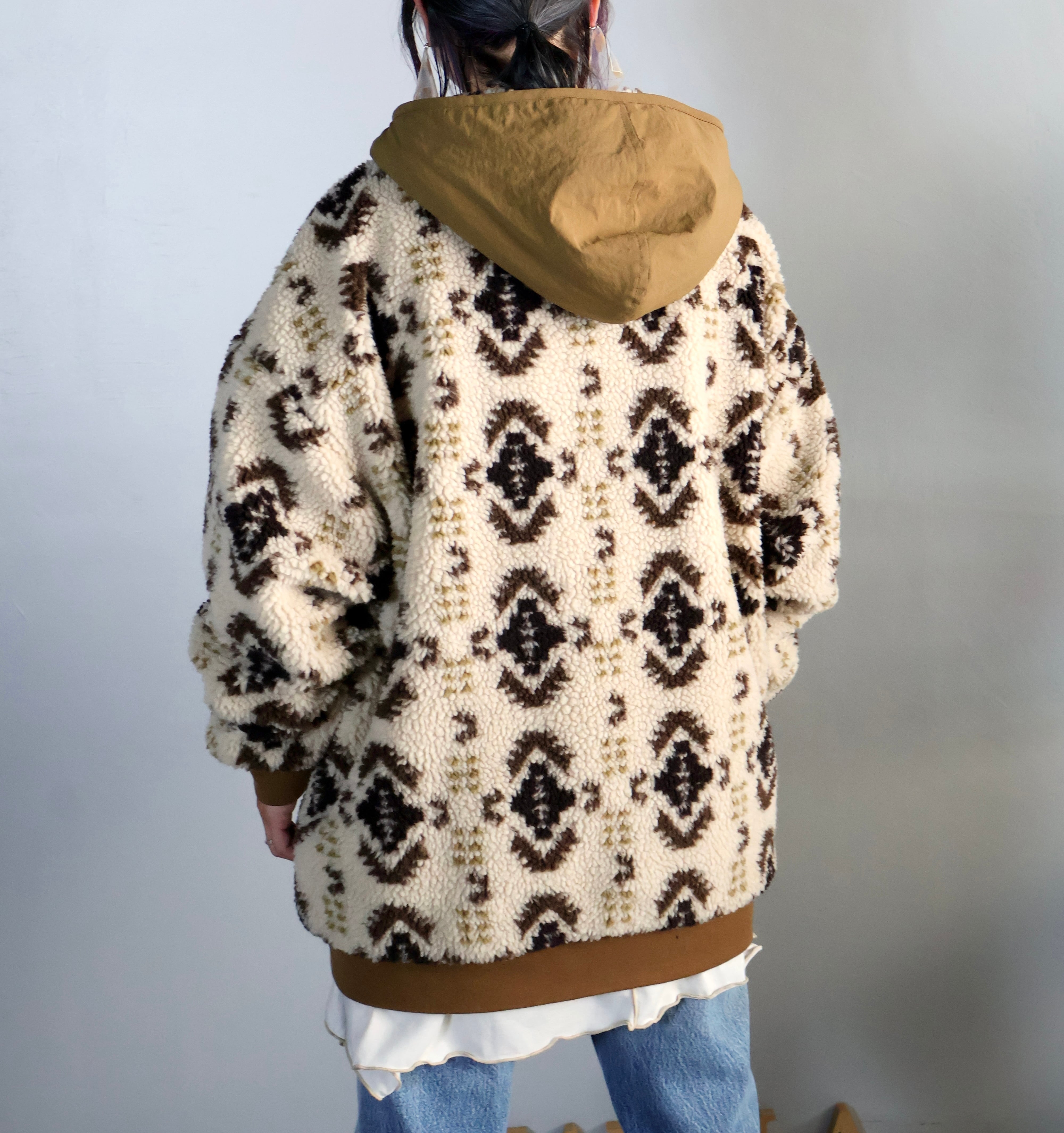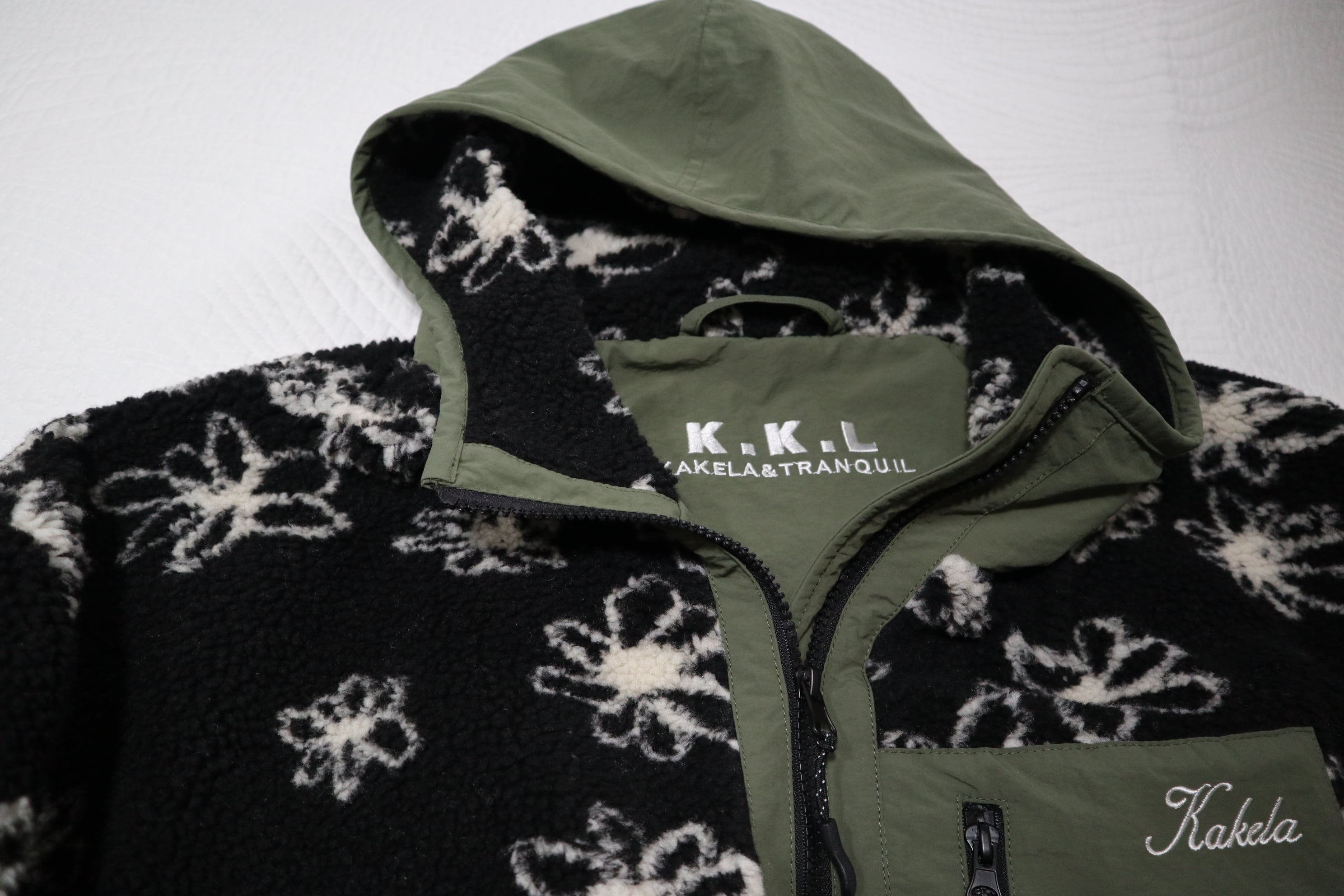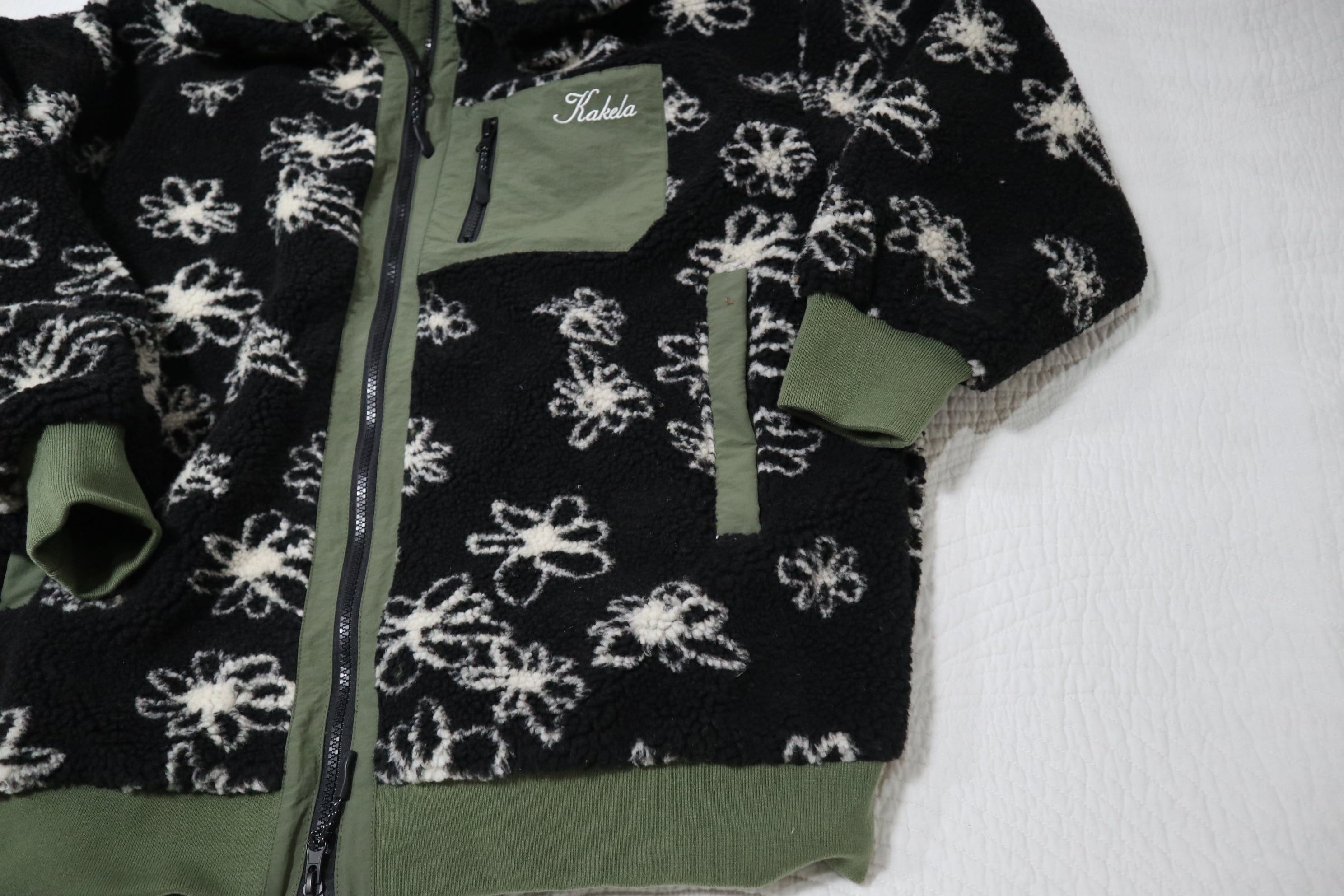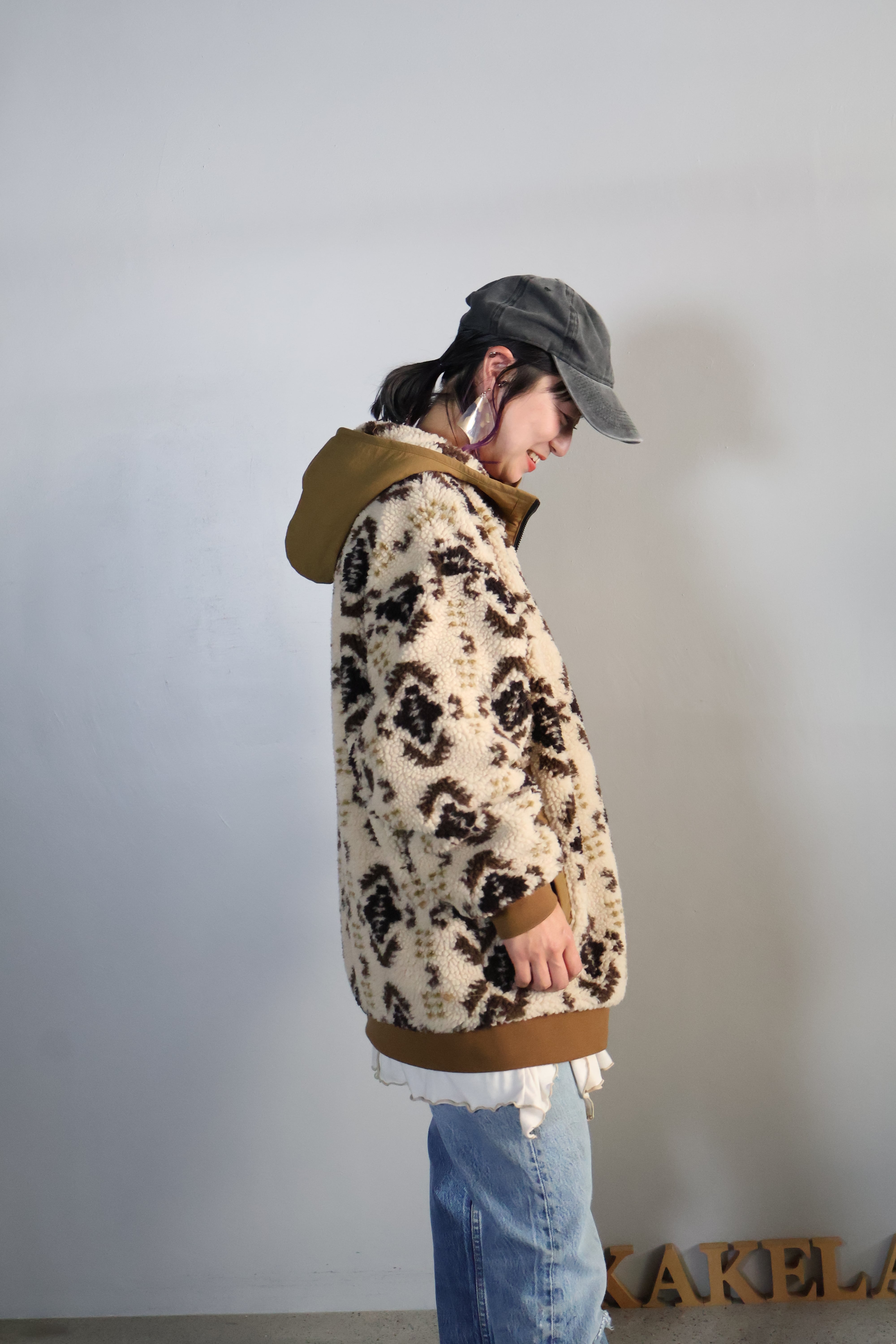 柄ボア×撥水ナイロン(総裏地)フードブルゾン【BLACK系花柄 01】です。